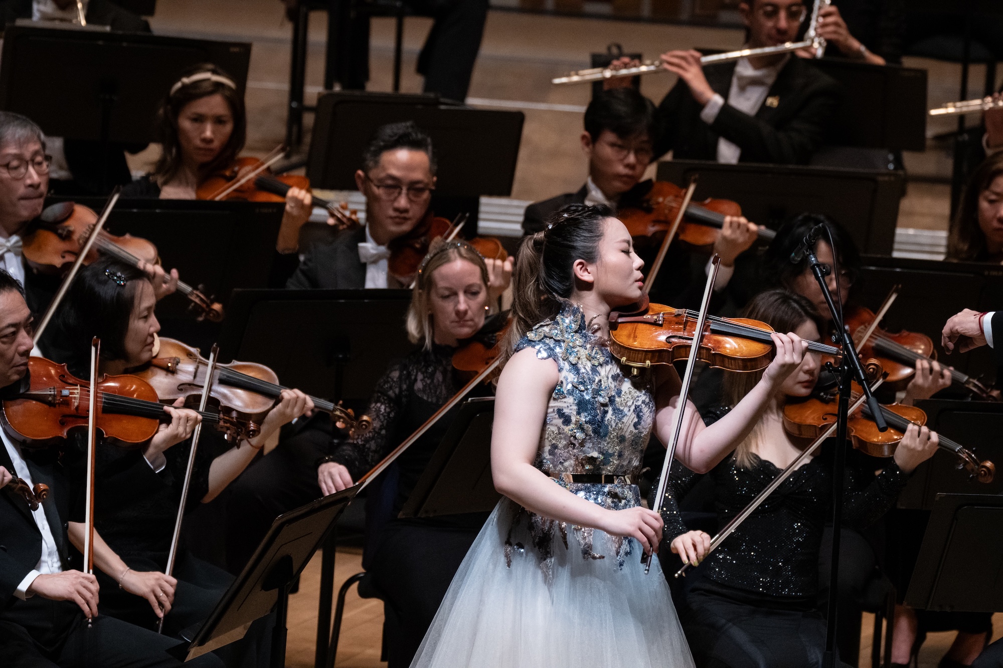 In the rare moments of break, judging by the expression on her face, she was completely submerged in the sound of the orchestra, looking at the invisible horizon.